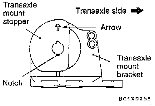2. Clamp the transaxle mount stopper so that the arrow points in the shown direction.