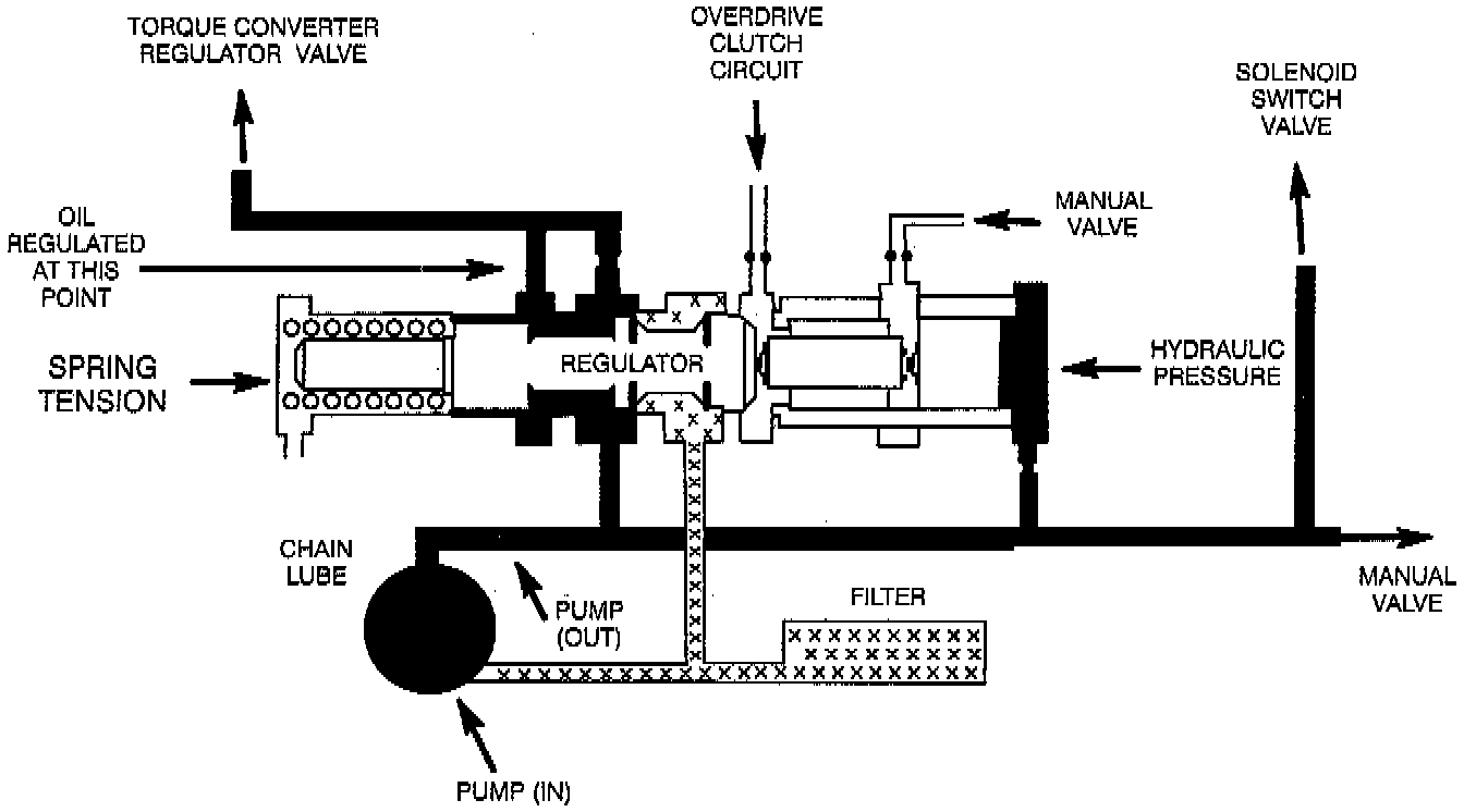 The regulator valve has one-function: to regulate or control-hydraulic pressure in the transaxle. The pump supplies unregulated pressure to the regulator valve. The regulator valve controls, or limits, pump pressure. Regulated pressure is referred to as "line pressure." The regulator valve has a spring on one end that pushes the valve to the right. This closes a dump (vent) to lower pressure. Closing the dump will cause oil pressure to increase. Oil pressure on the opposite end of the valve pushes the valve to the left, opening the dump and lowering oil pressure. The result is spring tension working against oil pressure to keep or maintain the oil at specific pressures. Regulated.pressure varies depending on the gear range the transaxle is operating in.