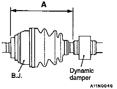 1. Install the dynamic damper in the position shown in the illustration (A) for the right side is 374 +/-3 mm (14.72 +/-0.12 inches) and 194 +/-3 mm (7.64 +/-0.12 inches) for the left side with manual transmission.
