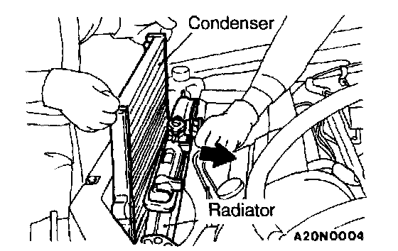 Move the radiator to the engine side and then lift up the condenser to remove it.