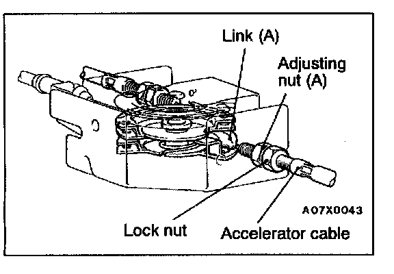 1. Adjust with the adjusting nut A so when the link A hits the stopper, the accelerator cable play (inner cable play reaches the standard value.