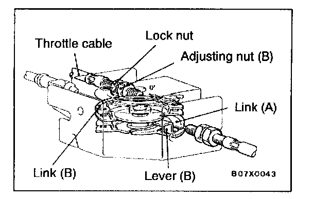 1. Adjust with the adjusting nut B so when the lever B hits the link A, the throttle cable play (inner cable play) reaches the standard value.