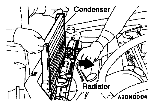 Move the radiator to the engine side and then lift up the condenser to remove it.