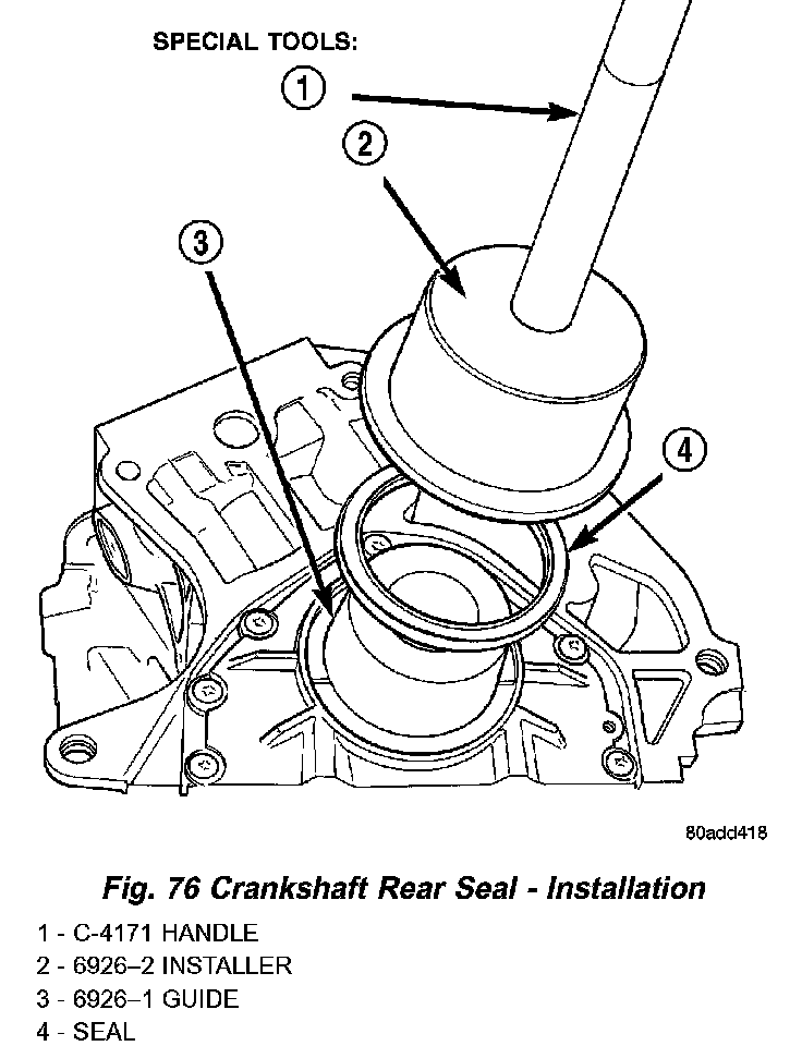 3. Using Special Tool 6926-2 Installer, and C-4171 Handle (Fig. 76), drive seal into the retainer housing until seal is flush with housing surface.