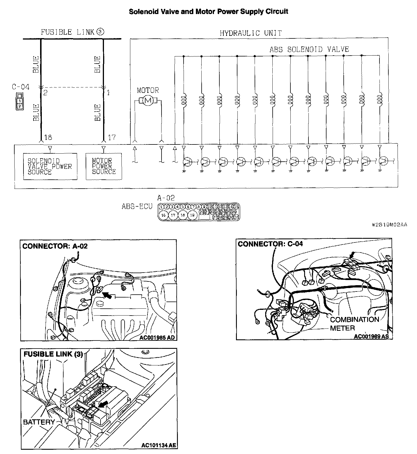 Power is continuously supplied to the ABS-ECU through fusible link number 3 to operate the solenoid valves and motor. The ABS-ECU supplies power to the solenoids. If controls each solenoid by switching the ground circuit ON or OFF, depending on driving conditions.
