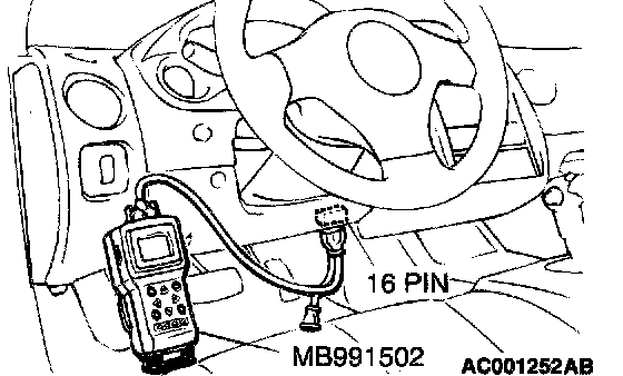CAUTION: To prevent damage to scan tool MB991502, always turn the ignition switch to the "LOCK" (OFF) position bef6re connecting or disconnecting scan tool MB991502.