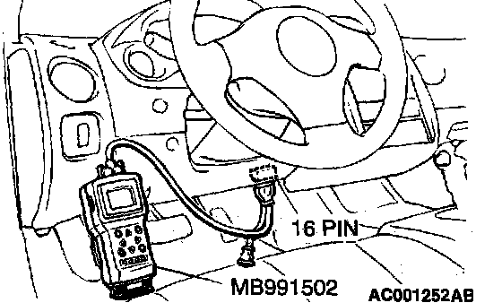 CAUTION: To prevent damage to scan tool MB991502, always turn the ignition switch to the "LOCK" (OFF) position before connecting or disconnecting scan tool MB9911602.