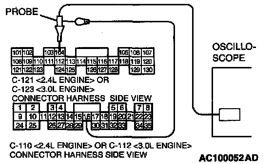 2. Connect an oscilloscope probe to PCM connector C-110 <2.4L Engine> or C-1 12 <3.0L Engine> terminal 16 and to PCM connector C-121 <2.4L Engine> or C-123 <3.01 Engine> terminal 104 by backprobing.