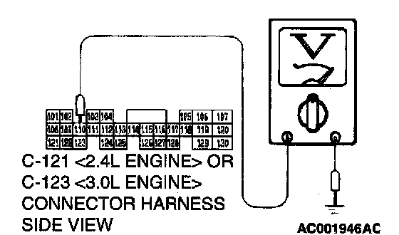 STEP 18. Check the switch output voltage at PCM connector C-121 <2.4L Engine> or C-123 <3.0L Engine> by backprobing. ("3" position)