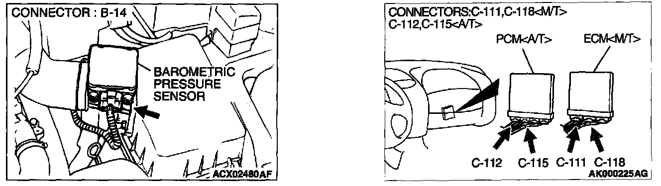 STEP 2. Check connector B-14 at the barometric pressure sensor for damage.