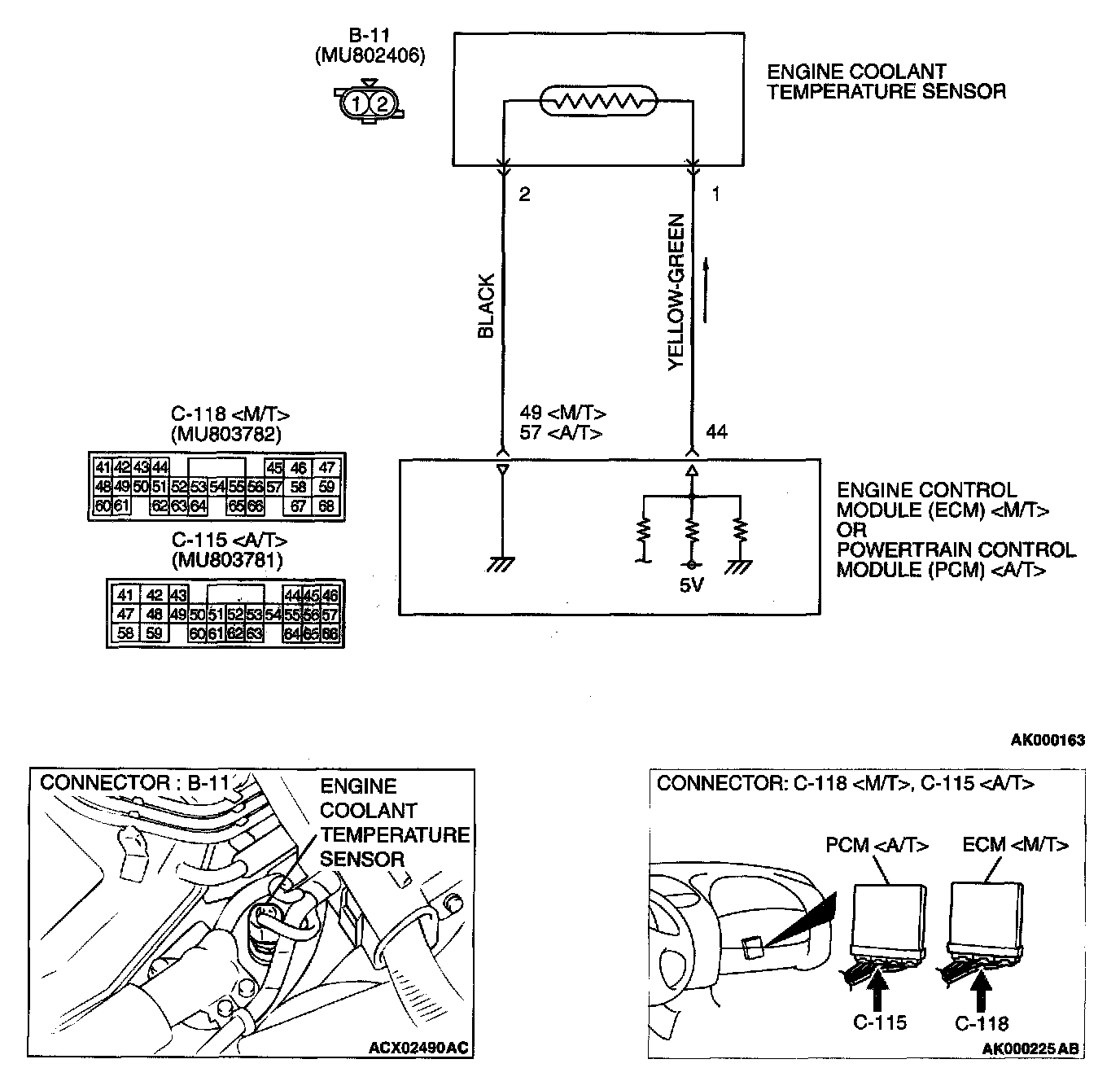 - 5-volt voltage is applied to the engine coolant temperature sensor output terminal (terminal 1) from the ECM (terminal 44)