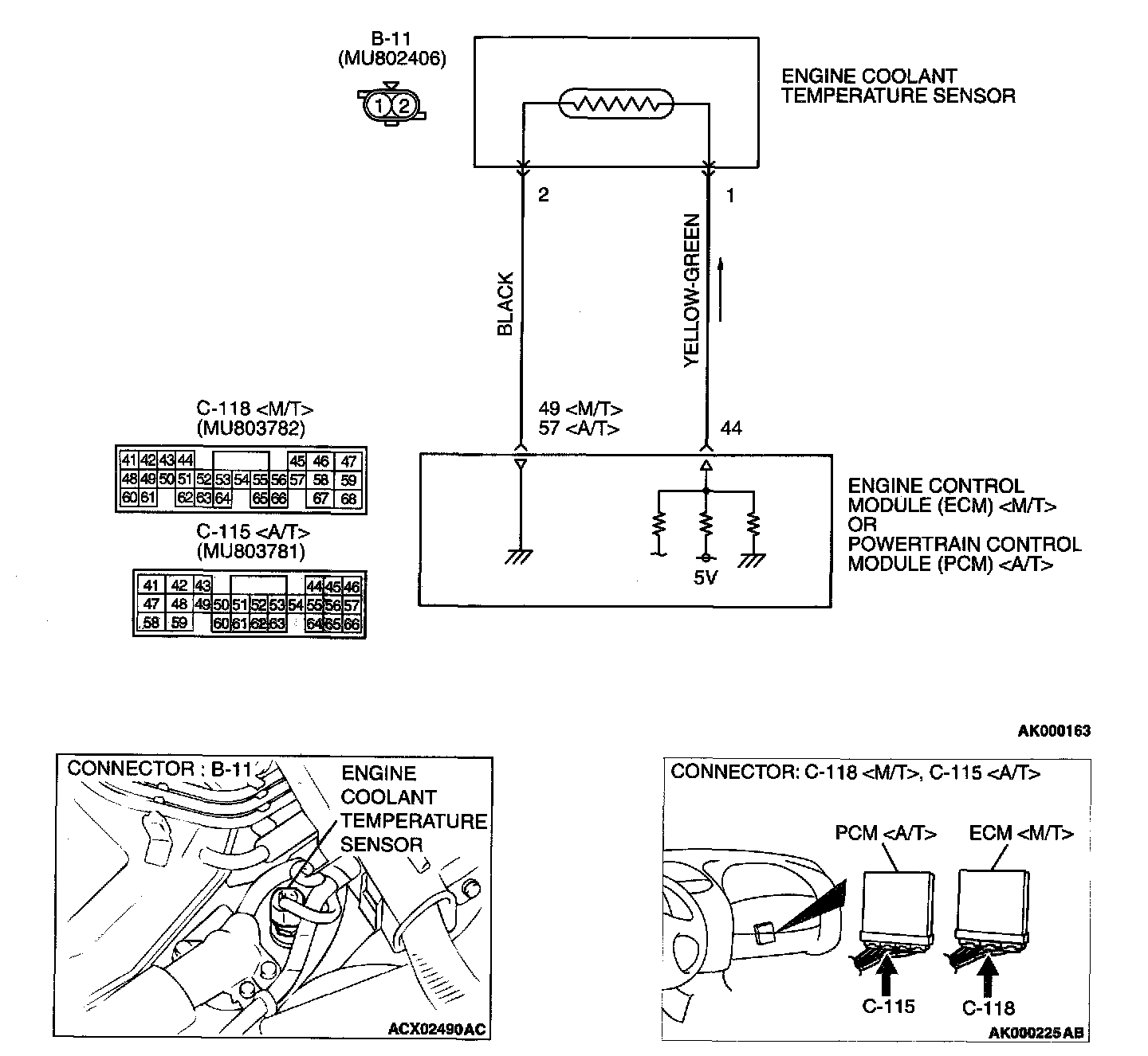 5-volt voltage is applied to the engine coolant temperature sensor output terminal (terminal 1) from the ECM (terminal 44)