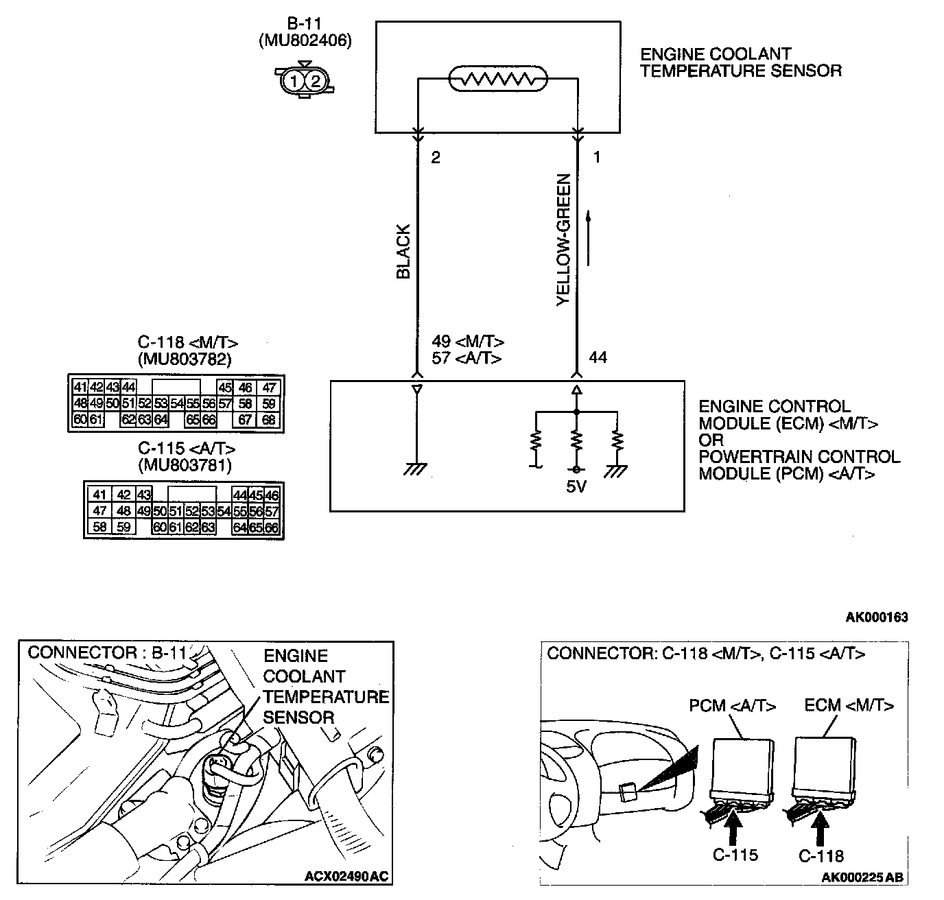 - 5-volt voltage is applied to the engine coolant temperature sensor output terminal (terminal 1) from the ECM (terminal 44)