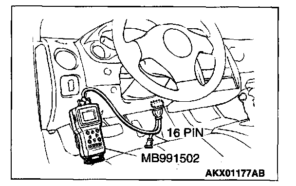 CAUTION: To prevent damage to scan tool MB991502, always turn the ignition switch to the "LOCK" (OFF) position before connecting or disconnecting scan tool MB991502.