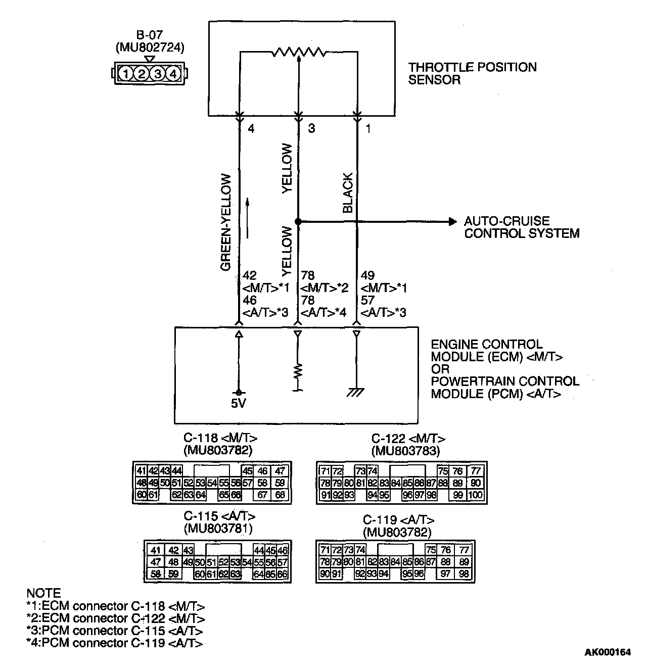 STEP 6. Check for harness damage between throttle position sensor connector B-07 terminal 4 and ECM connector C-118 terminal 42