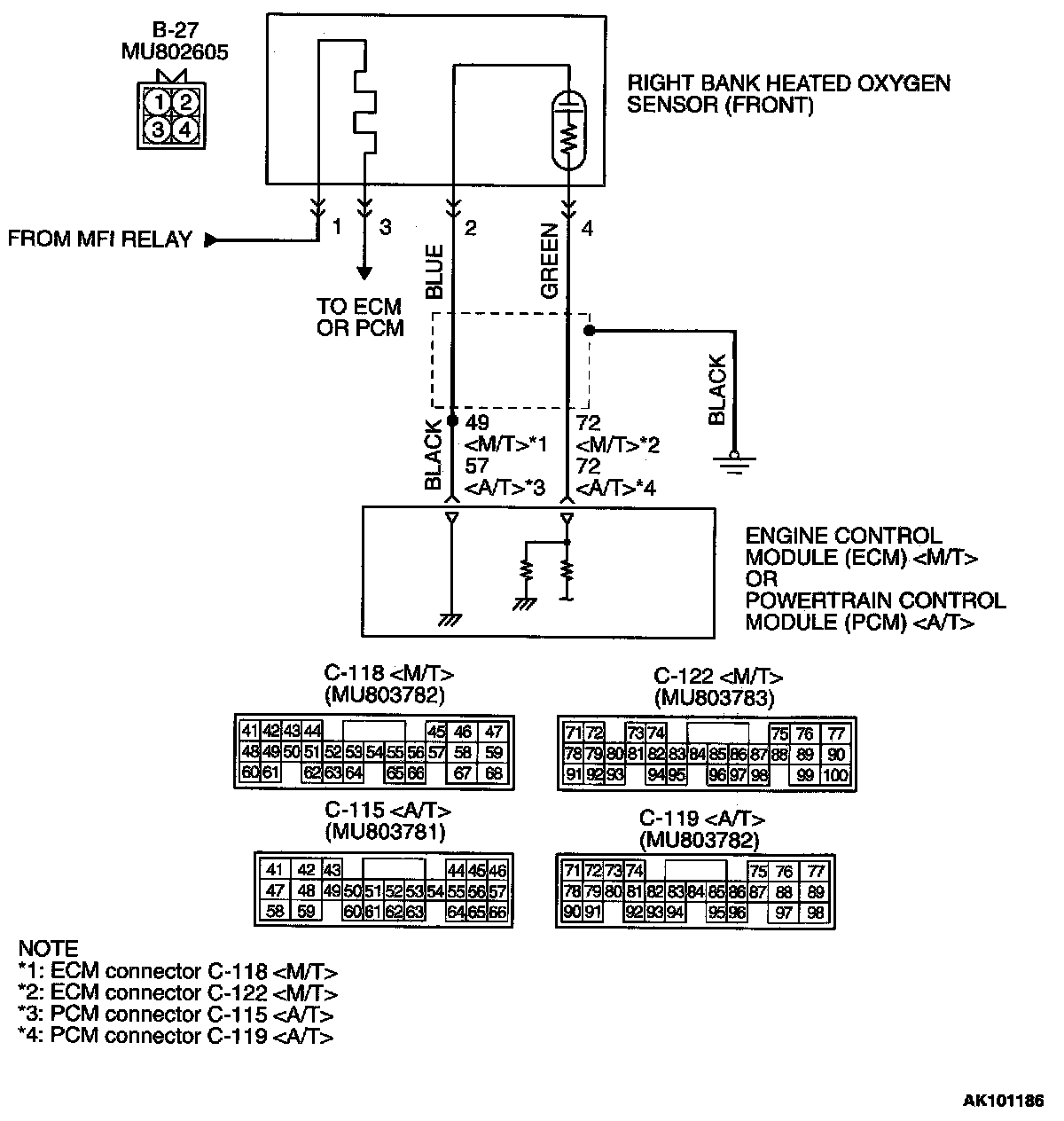YES: Repair harness wire between right bank heated oxygen sensor (front) connector B-27 terminal 4 and ECM connector C-122 terminal 72