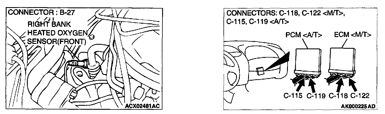 STEP 4. Check connector B-27 at right bank heated oxygen sensor (front) and connector C-122 at ECM