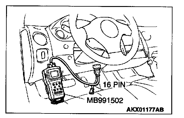 CAUTION: To prevent damage to scan tool MB991502, always turn the ignition switch to the "LOCK" (OFF) position before connecting or disconnecting scan tool MB991502.