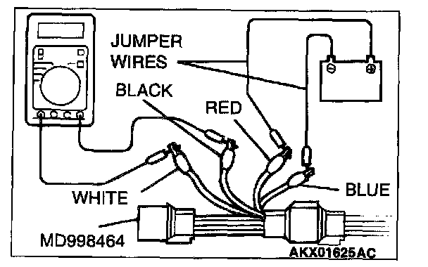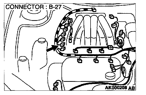 1. Disconnect the right bank heated oxygen sensor (front) connector B-27 and connect test harness special tool, MD998464, to the connector on the right bank heated oxygen sensor (front) side.