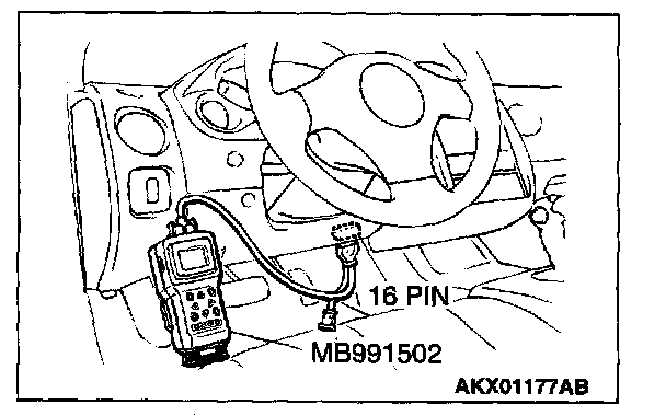 CAUTION: To prevent damage to scan tool MB991502, always turn the ignition switch to the "LOCK" (OFF) position before connecting or disconnecting scan tool MB991502.
