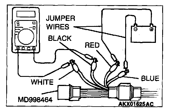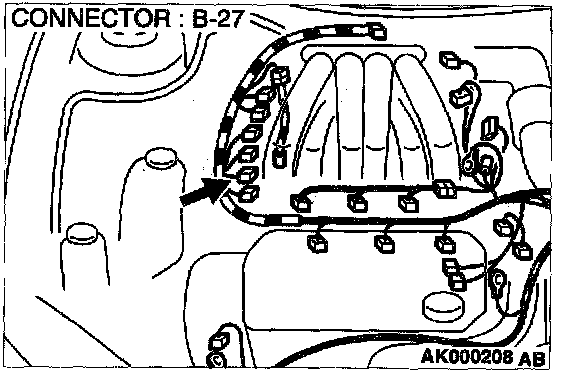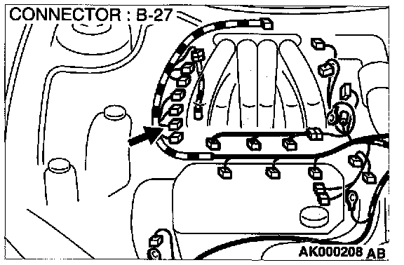 1. Disconnect the right bank heated oxygen sensor (front) connector B-27 and connect test harness special tool, MD998464 to the connector on the right bank heated oxygen sensor (front) side.