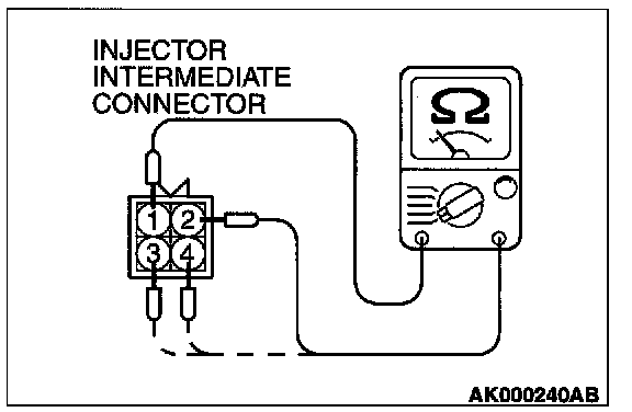 2. Measure the resistance between injector side connector terminal 1 and 2.