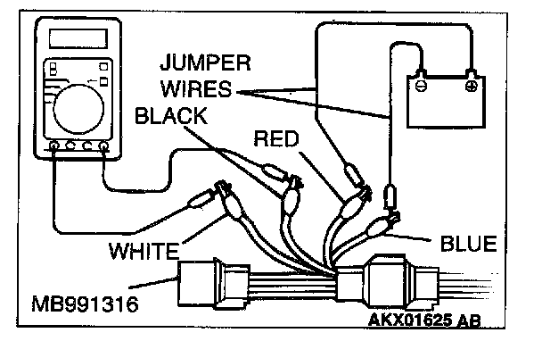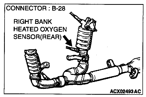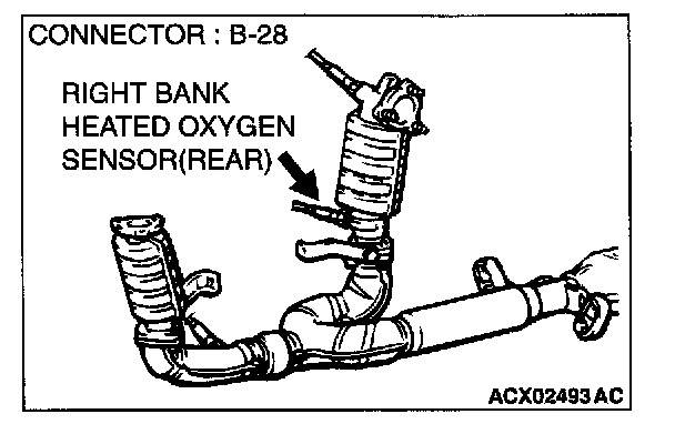 1. Disconnect the right bank heated oxygen sensor (rear) connector B-28 and connect test harness special tool, MB991316, to the connector on the right bank heated oxygen sensor (front) side.