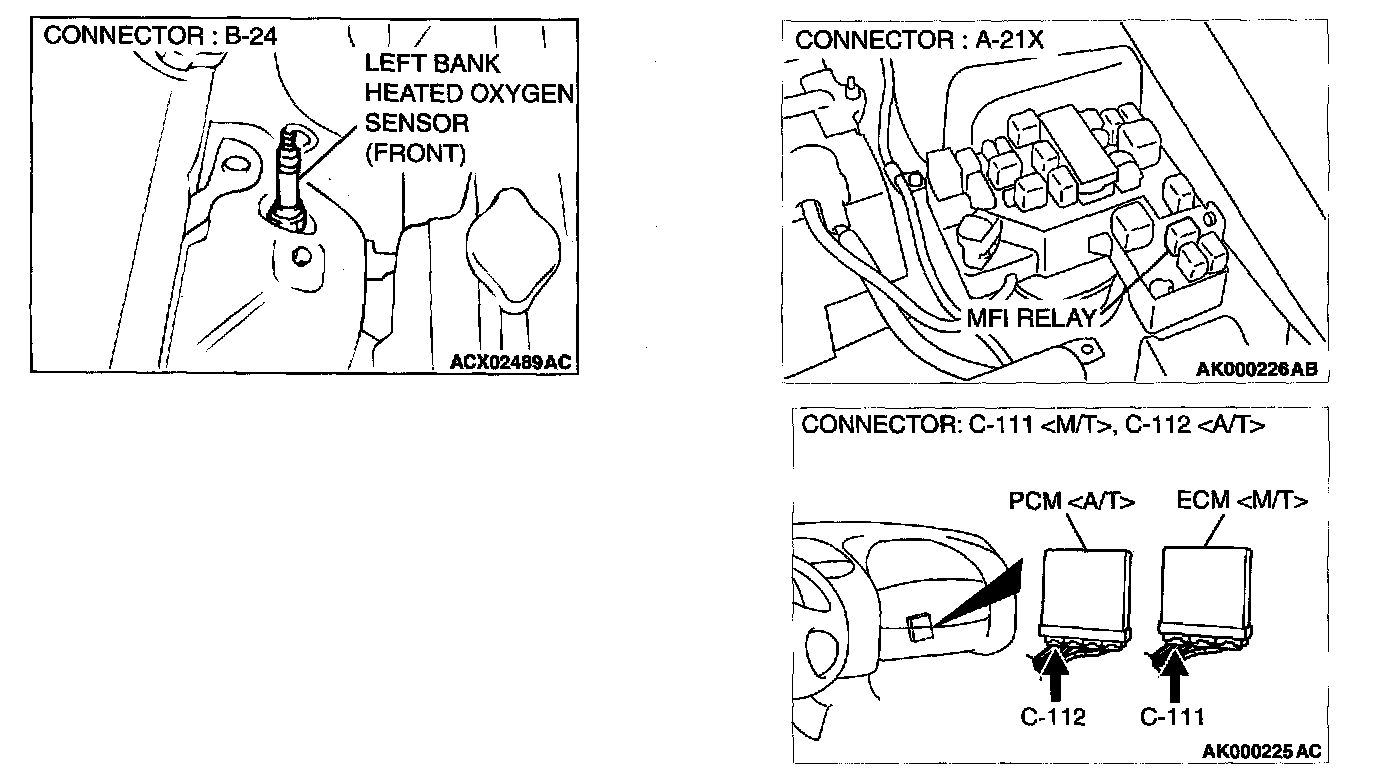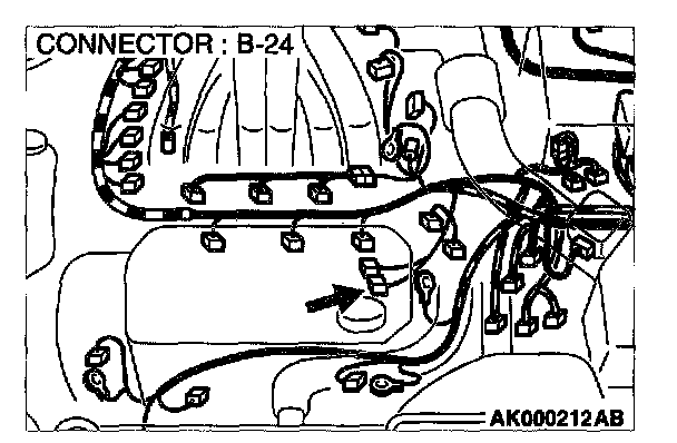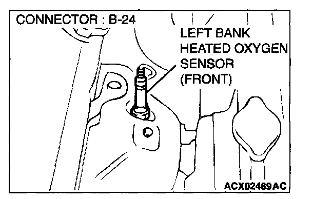 1. Disconnect left bank heated oxygen sensor (front) connector B-24 and connect test harness special tool, MD998464, to the connector on the left bank heated oxygen (front) sensor side.