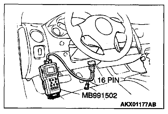 CAUTION: To prevent damage to scan tool MB991502, always turn the ignition switch to the "LOCK" (OFF) position before connecting or disconnecting scan tool MB991502.