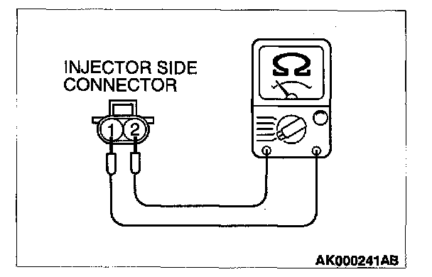 2. Measure the resistance between each injector side connector terminal 1 and 2.