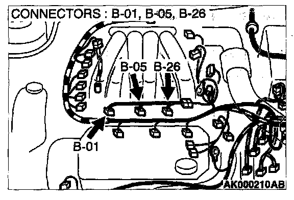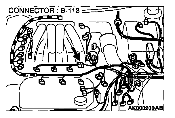 1. Disconnect the injector intermediate connector B-118 and connect the test harness special tool (MD998464) in-between.