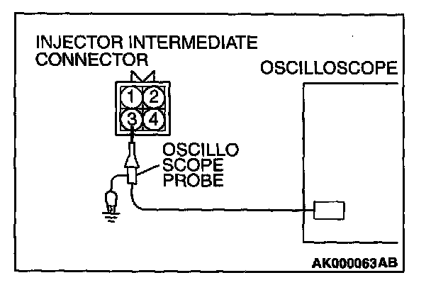 2. Connect the oscilloscope probe to each injector intermediate connector terminal to oscilloscope each cylinder: