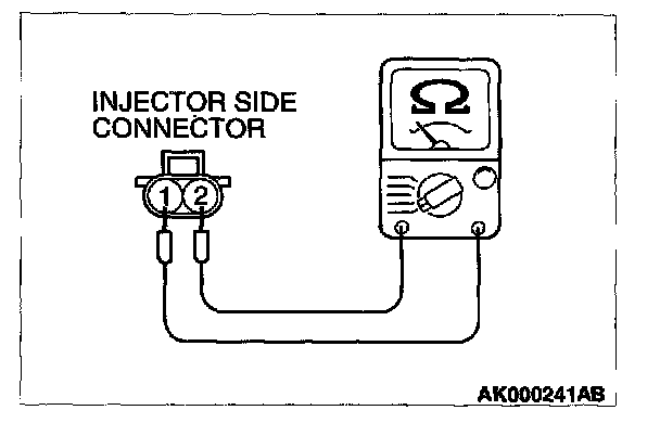 2. Measure the resistance between each injector side connector terminal 1 and 2.