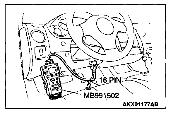 CAUTION: To prevent damage to scan tool MB991502, always turn the ignition switch to the "LOCK" (OFF) position before connecting or disconnecting scan tool MB991502.