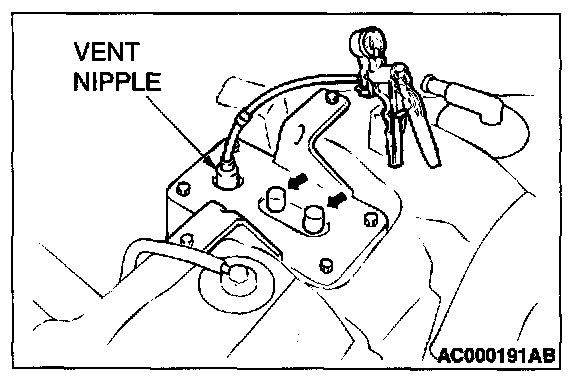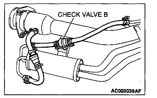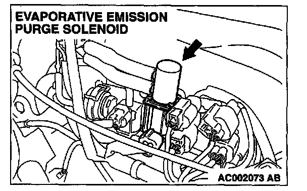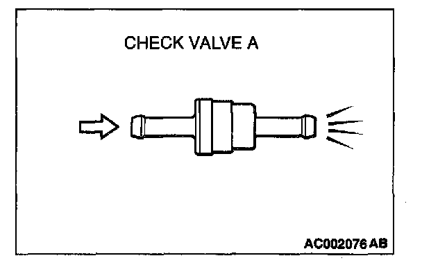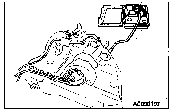 3. Set scan tool MB991502 to actuator test mode for item 08: Evaporative Emission Purge Solenoid. When the evaporative emission purge solenoid is operated, apply a pressure on the hand vacuum pump and confirm that air is blown from the other side nipple.
