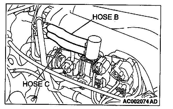 1. Disconnect hoses B and C from the evaporative emission purge solenoid side, and connect the hand vacuum pump to the evaporative emission purge solenoid instead of hose C.