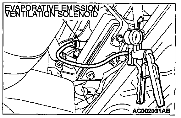 5. Set scan tool MB991502 to actuator test mode for item 29: Evaporative Emission Ventilation Solenoid. When the evaporative emission ventilation solenoid is operated, apply a pressure on the hand vacuum pump and confirm that air is maintained.