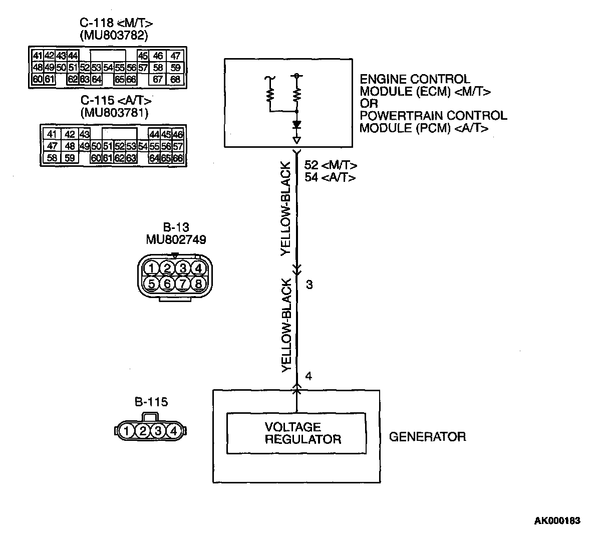 STEP 8. Check for open circuit and short circuit to ground between generator connector B-115 terminal 4 and ECM connector C-118 terminal 52