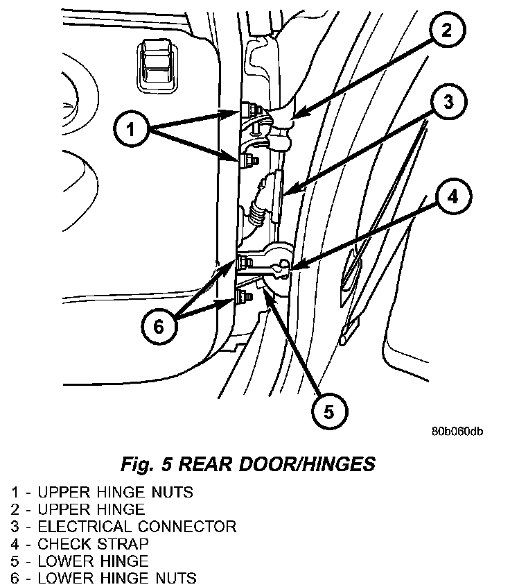 3. If door needs to be adjusted Fore/Aft loosen B-pillar to hinge bolts (Fig. 5).