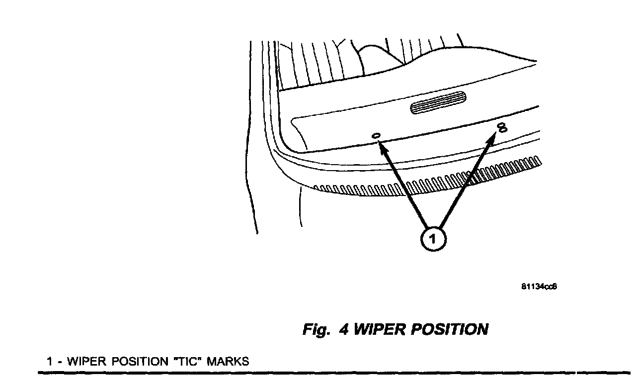 1. Check the position of the windshield wiper assemblies in the park (off) position. If the wipers are above the positioning ("tic") marks on the windshield adjust as necessary (Fig. 4).
