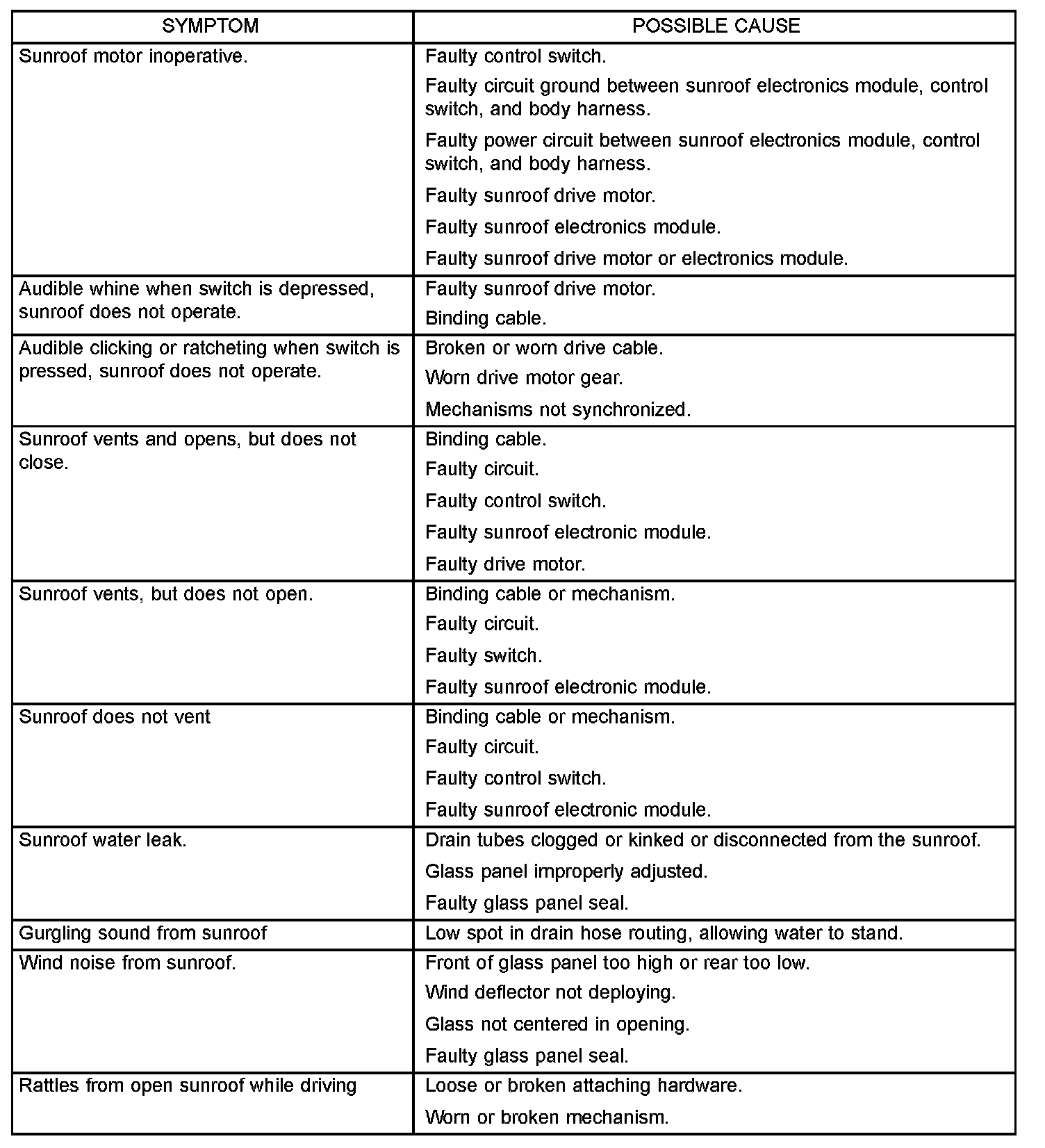 Sunroof Diagnosis Chart:
