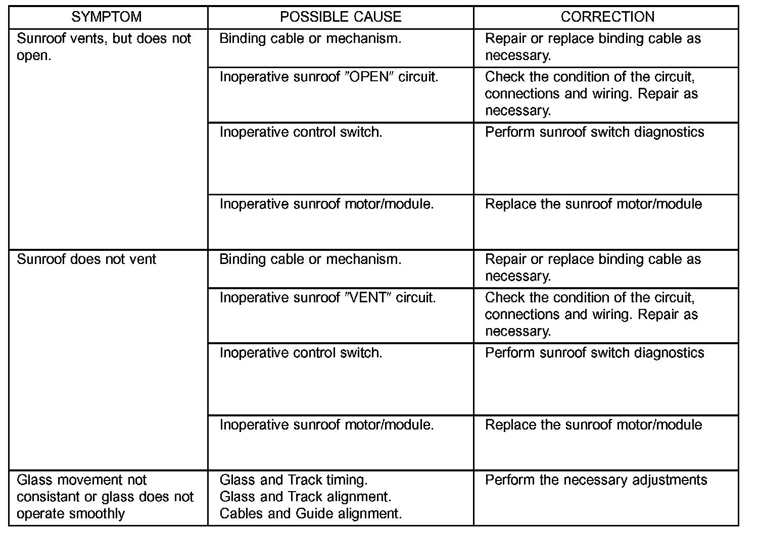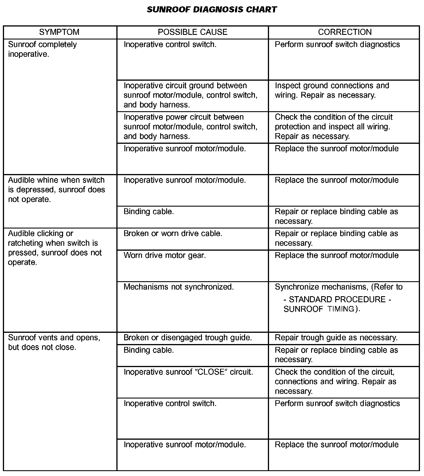 Refer to SUNROOF DIAGNOSIS CHART for possible causes. Before beginning sunroof diagnostics verify that all other power accessories are in proper