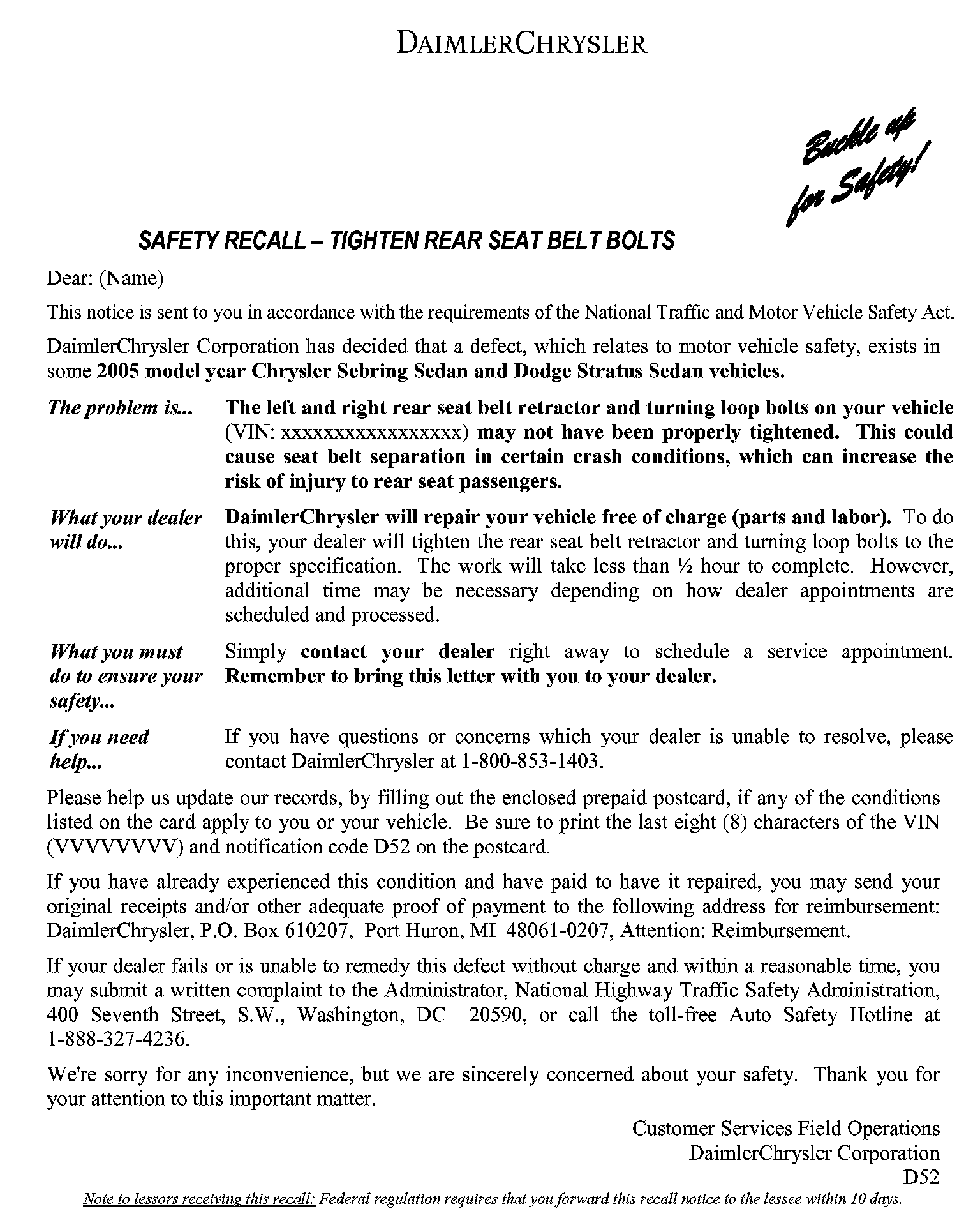 Recall - Rear Seat Belt Retractor Bolt Torque