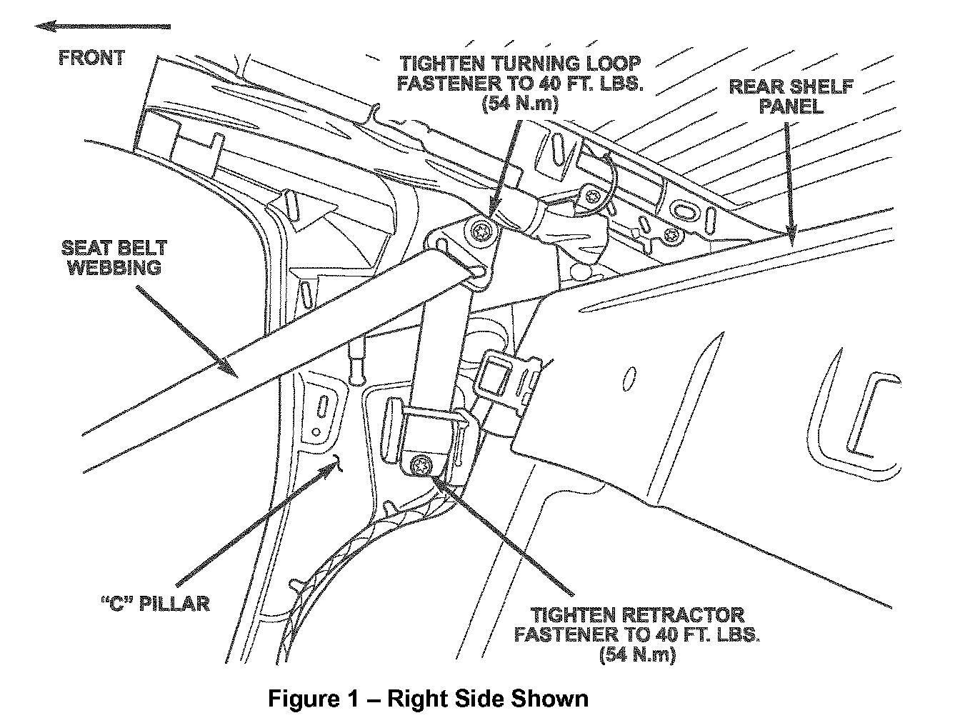4. Using a torque wrench, tighten the right and left side turning loop and the seat belt retractor mounting bolts to 40 ft. lbs. (54 N.m).