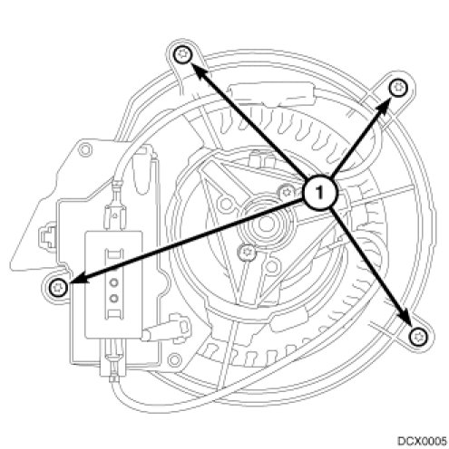 2. Install the screws (1) attaching the blower motor to the heater housing.