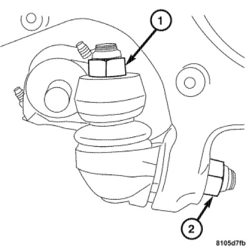 3. Install the nut (2) attaching the lower control arm to the steering knuckle lower ball joint. Tighten to 45 Nm (33 ft. lbs.).