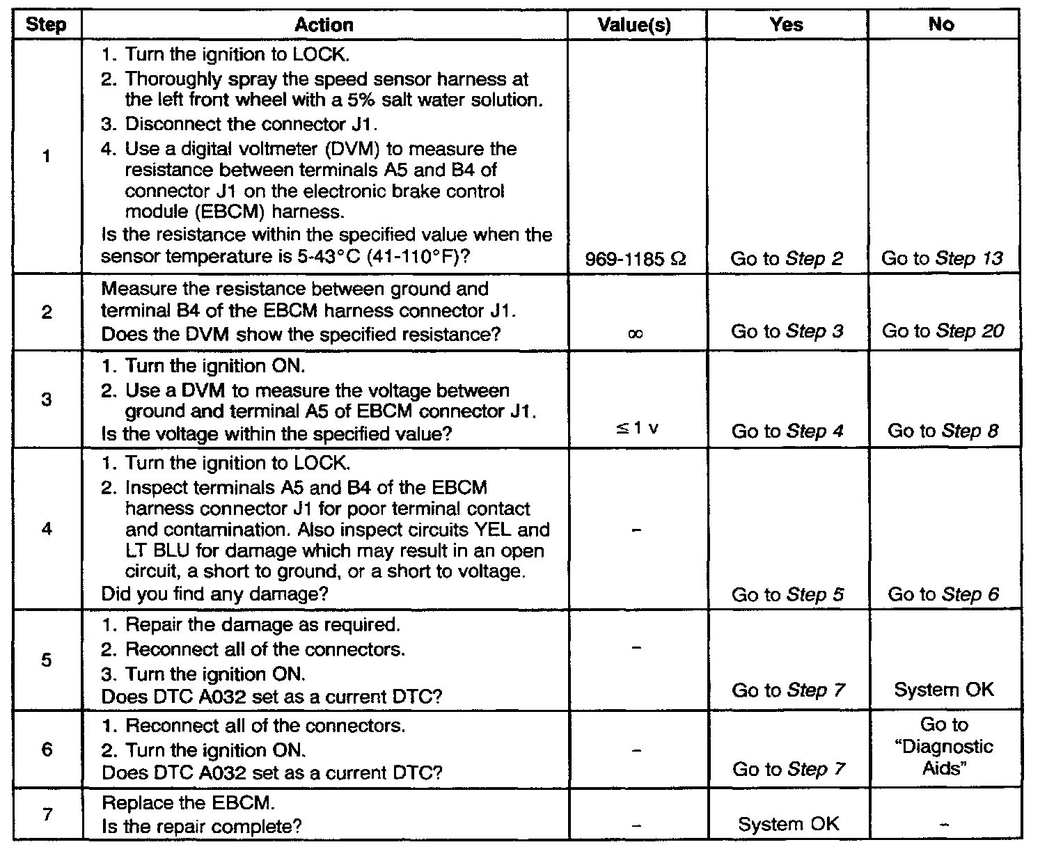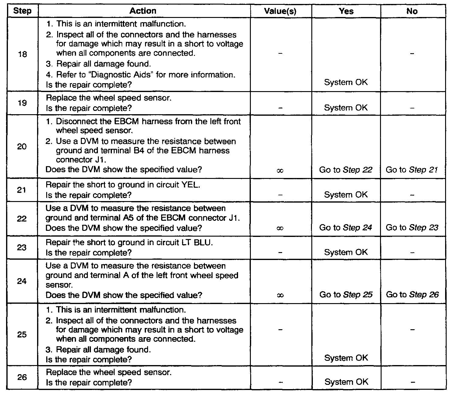 Important: Wheel speed sensor intermittent malfunctions may be difficult to locate. Take care not to disturb any electrical connections before performing an indicated step of this table. That will ensure that an intermittent connection will not be corrected before the source of the malfunction is found.