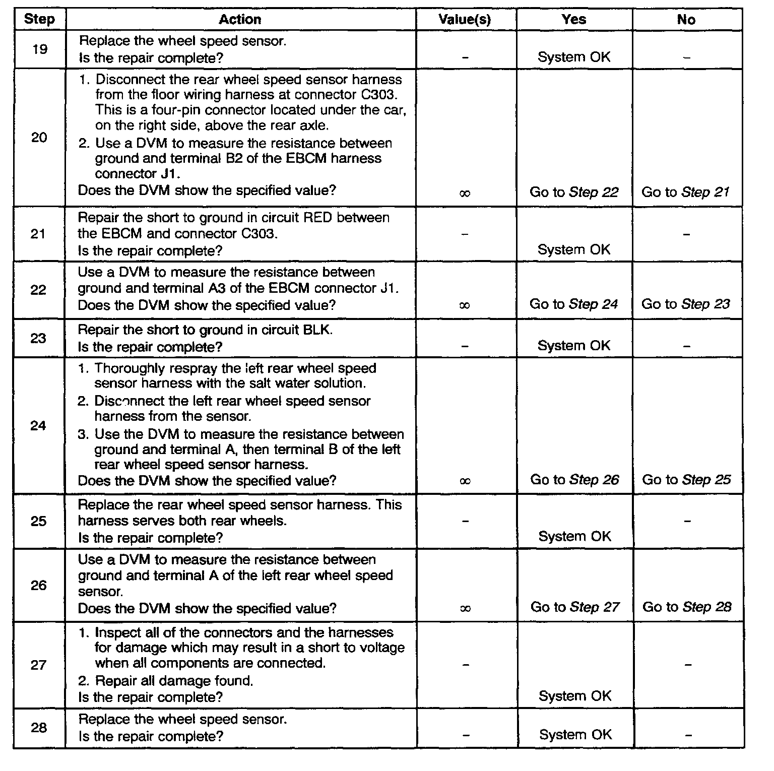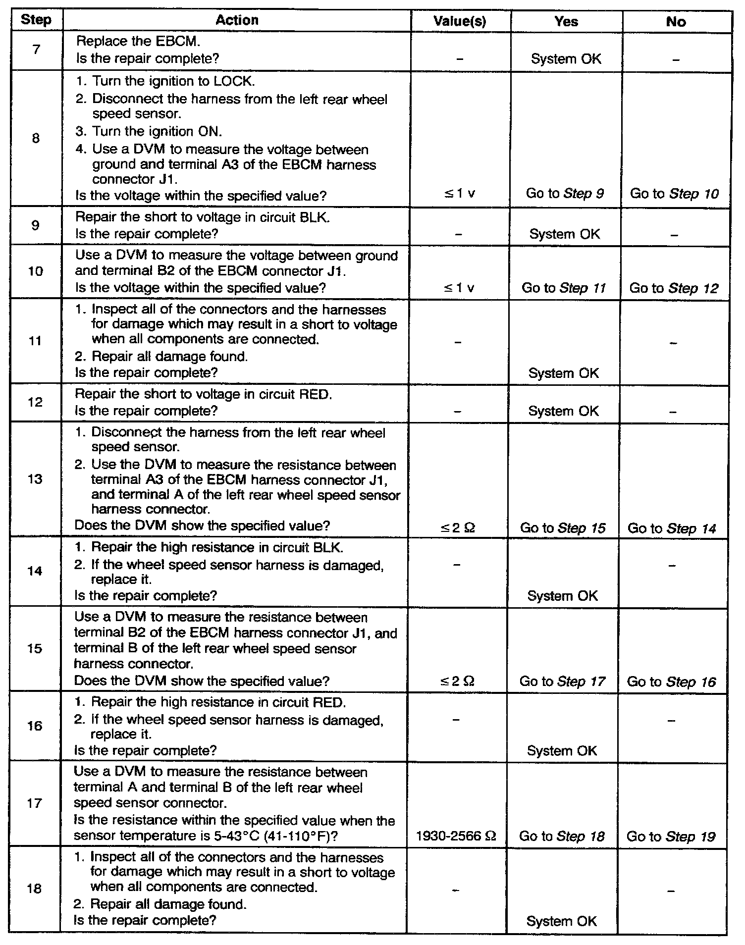Important: Wheel speed sensor intermittent malfunctions may be difficult to locate. Take care not to disturb any electrical connections before performing an indicated step of this table. That will ensure that an intermittent connection will not be corrected before the source of the malfunction is found.