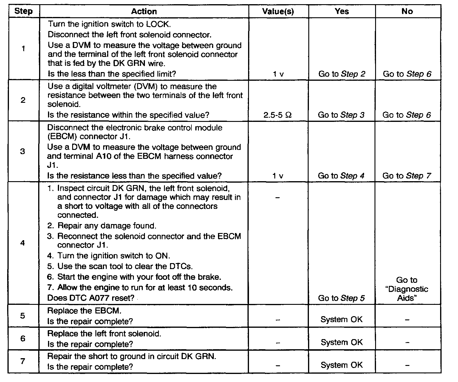 DTC A077 - Left Front Solenoid Circuit Shorted to Battery