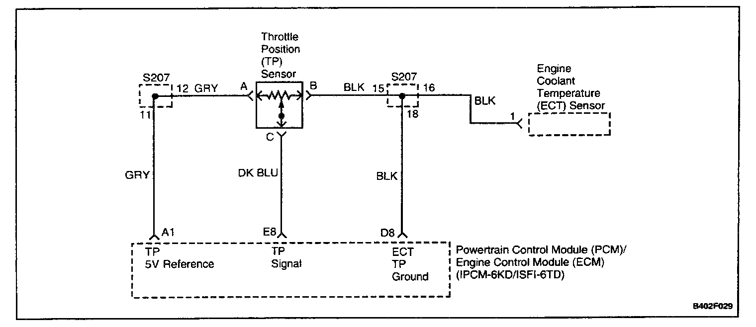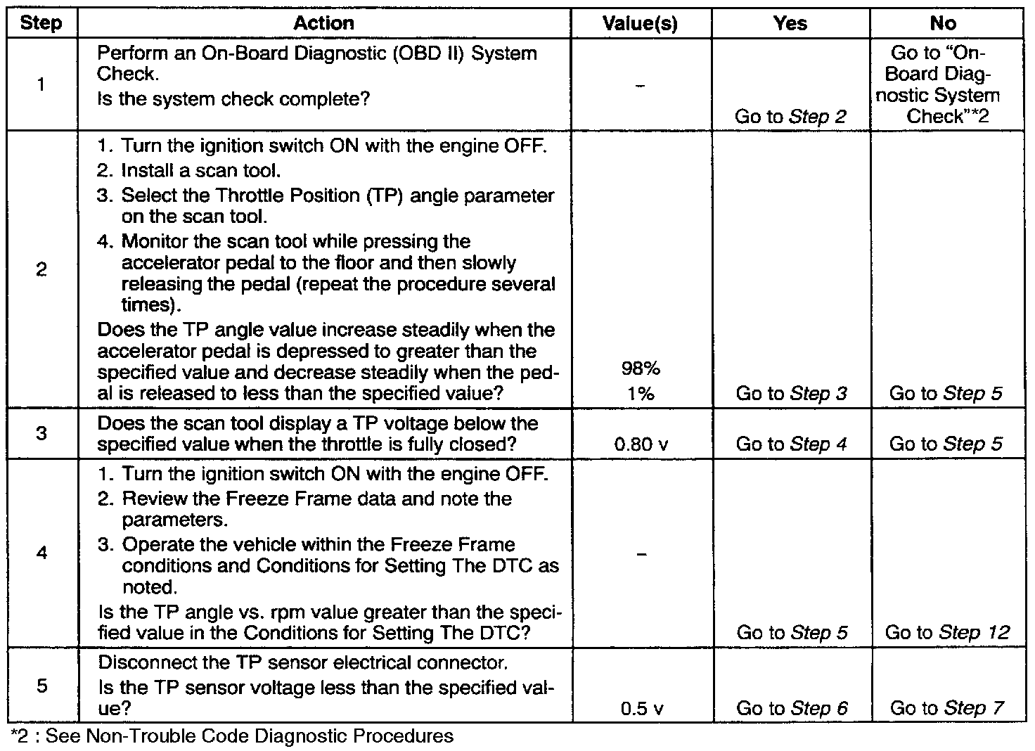 2. The TP sensor has an auto zeroing feature. If the voltage reading is between 0.2 to 0.9 volts, the PCM/ ECM will assume the TP sensor is at a closed throttle position (0%). If the reading is out of the auto zeroing range at closed throttle, look for a binding or damaged linkage.
